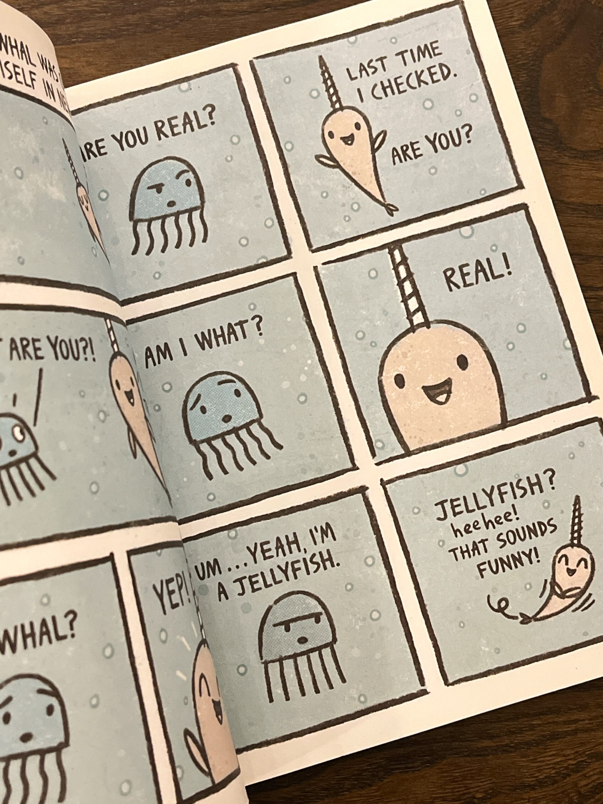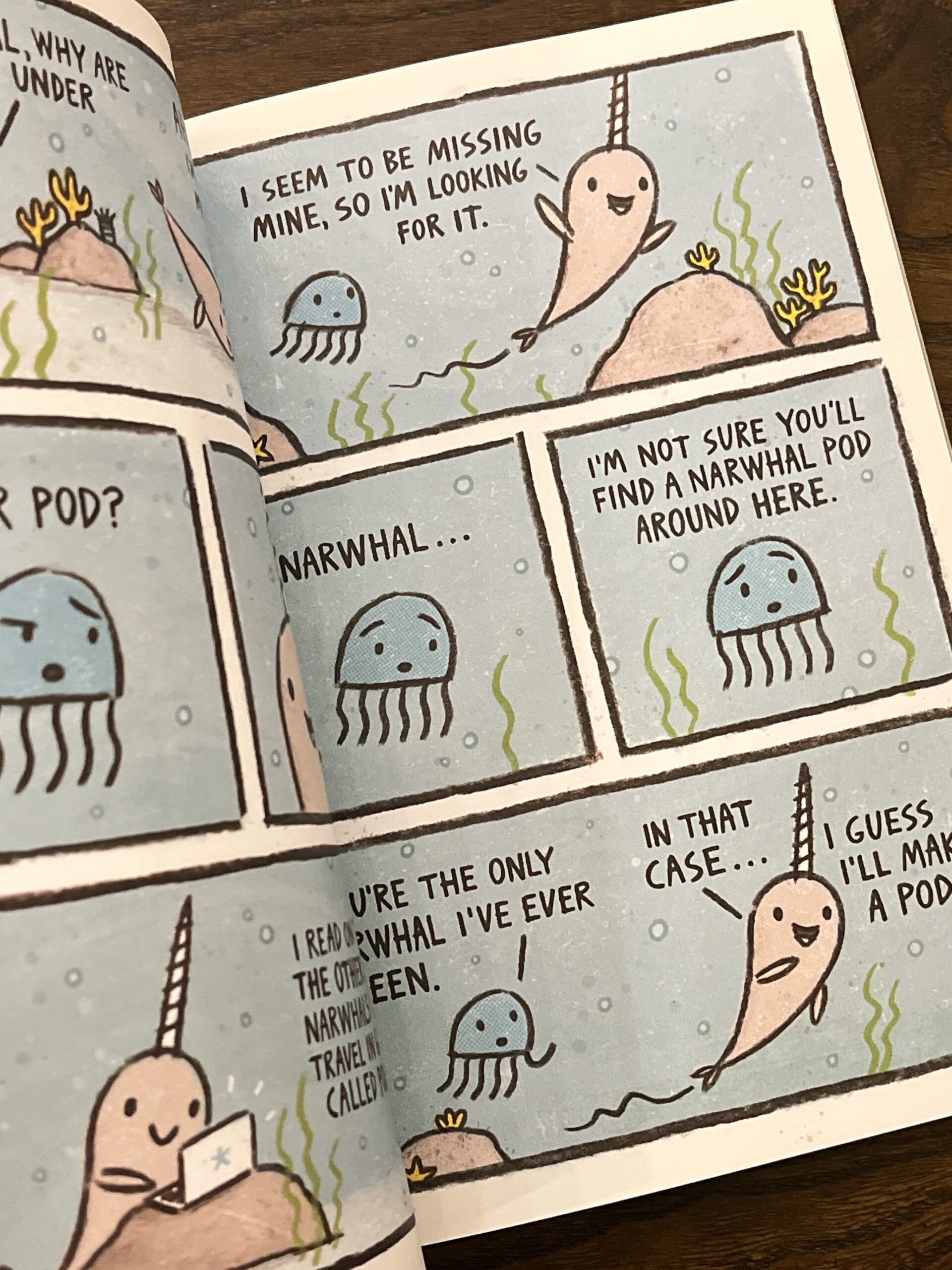 In the first, Jelly learns that Narwhal is a really good friend. Then Narwhal and Jelly form their own pod of awesomeness with their ocean friends. And finally, Narwhal and Jelly read the best book ever!